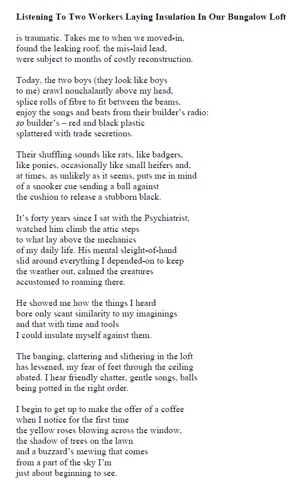 Second prize in our 2023 Open Poetry Competition was awarded to Listening To Two Workers Laying Insulation In Our Bungalow Loft, by Roger Hare. @RogerHare6
