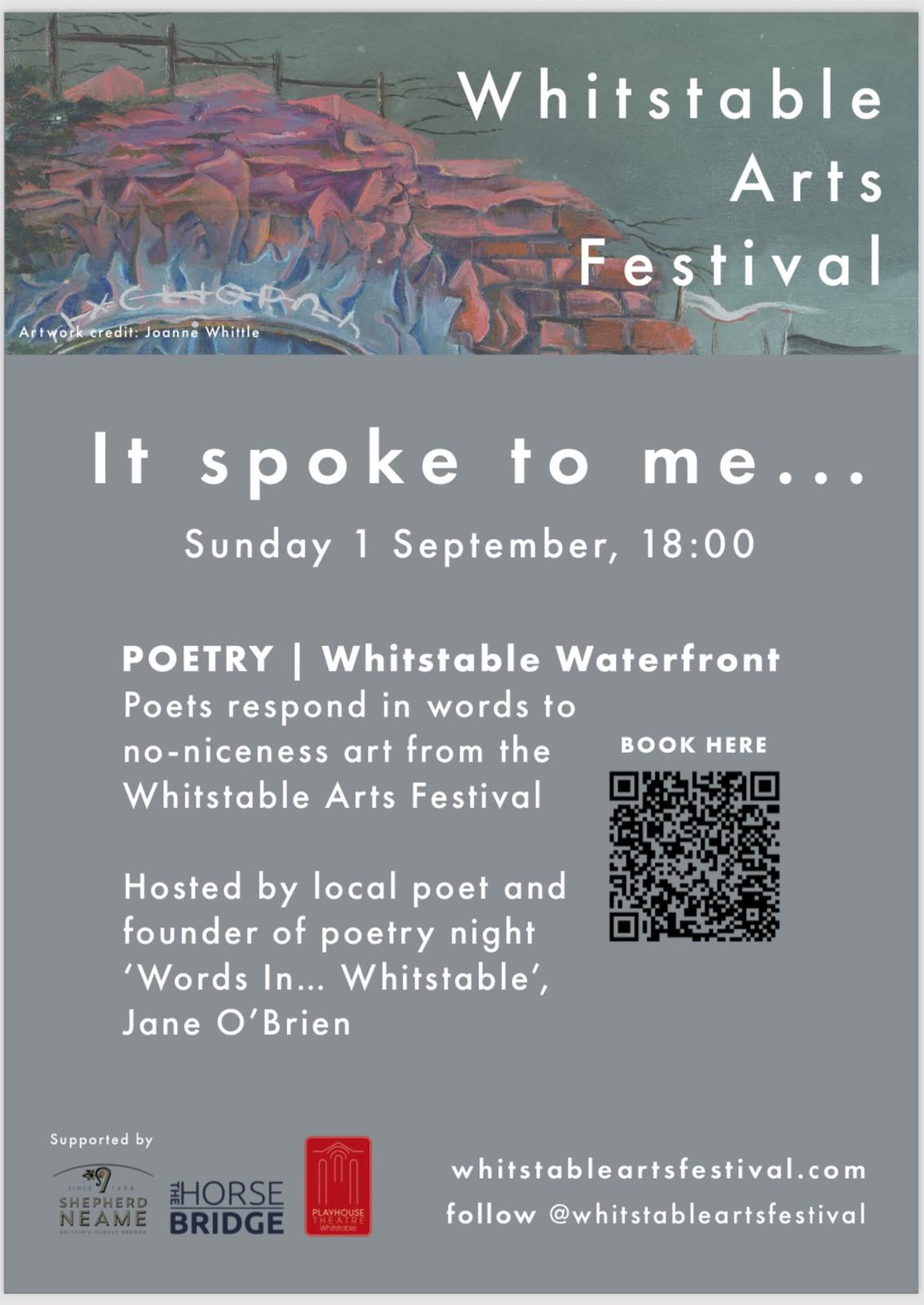 Meanwhile three other K&S members are taking part in ‘It Spoke to me‘ at the Whitstable Arts Festival on Sunday 1st September. The event is organised by Jane O’Brien. Jane, along with Caroline Franklyn and Phil Vernon and seven other poets, will read new poems inspired by the Festival’s ‘Unnavigated‘ art exhibition. ‘It Spoke to Me’ will be held at the Whitstable Waterfront.