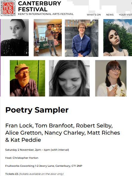 The second event is Poetry Sampler, a fringe event for the Canterbury Festival taking place at Fruitworks on 2nd November (2pm – 4pm) which includes poets Fran Lock, Tom Branfoot, Robert Selby, Alice Gretton, Nancy Charley, Matt Riches & Kat Peddie. For more details, click here. (Tickets on the door).