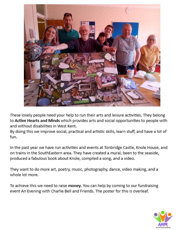 One of our lovely long-standing members – Charlie Bell – is hosting an event for local poets and musicians to raise money for Active Hearts & Minds.