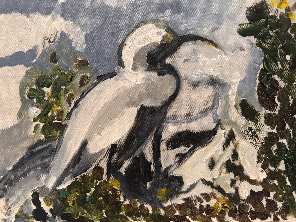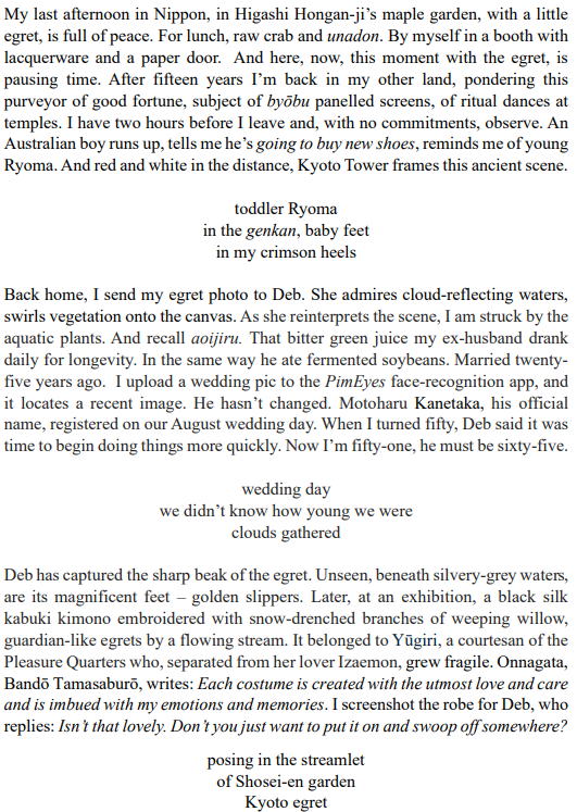 In third place for the Open Competition was the winning poem Kyoto Egret by Alexandra Corrin-Tachibana. This is a piece which has an accompanying painting, created by Deborah Catesby who unfortunately passed away in December of 2025.